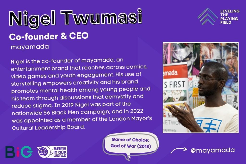 Nigel Twumasi is the co-founder of mayamada, an entertainment brand that reaches across comics, video games and youth engagement. His use of storytelling empowers creativity and his brand promotes mental health among young people and his team through discussions that demystify and reduce stigma. In 2019 Nigel was part of the nationwide 56 Black Men campaign, and in 2022 was appointed as a member of the London Mayor’s Cultural Leadership Board.